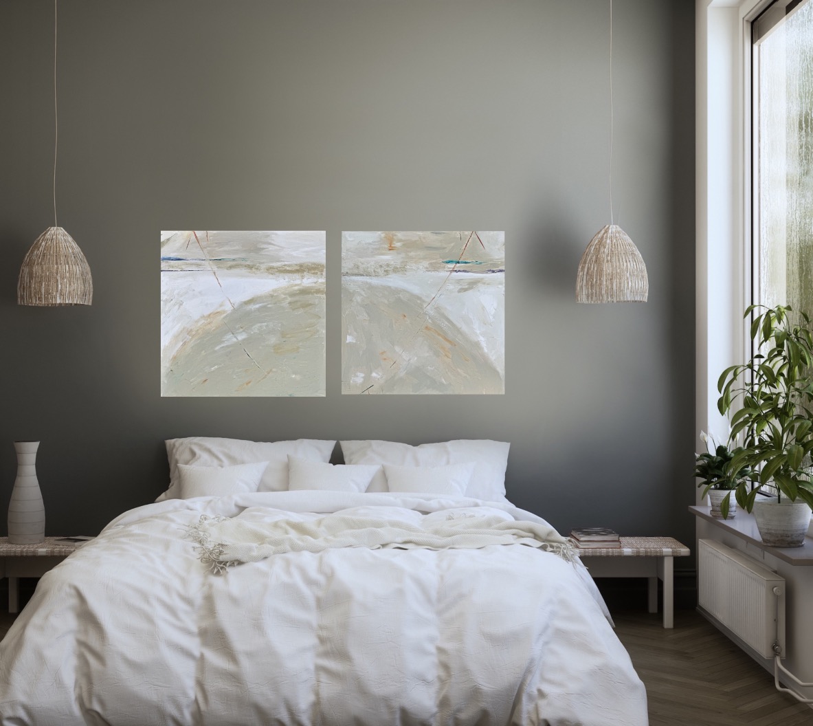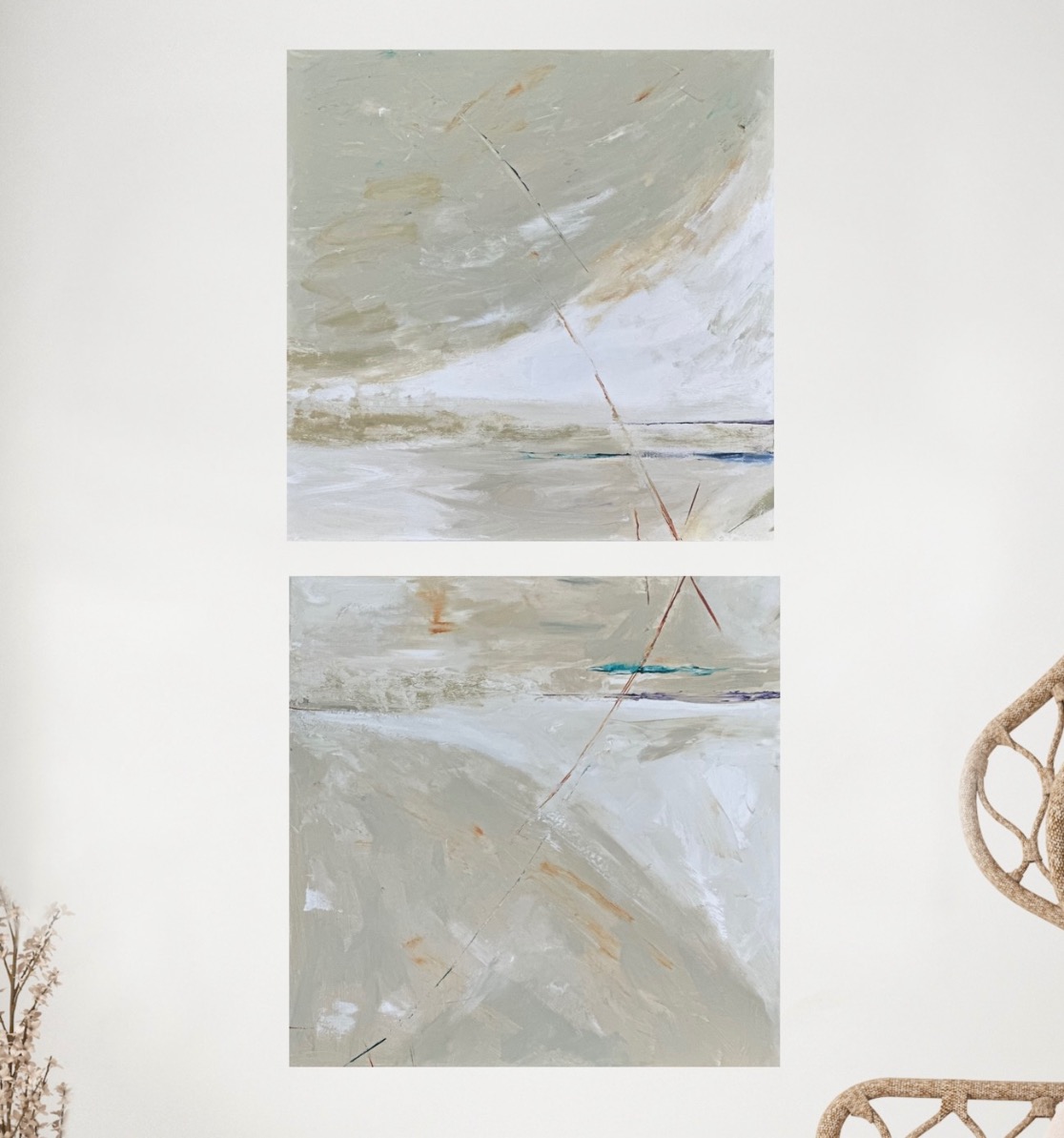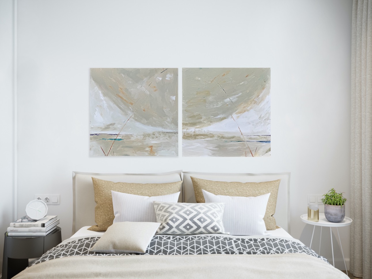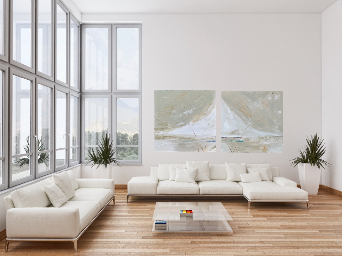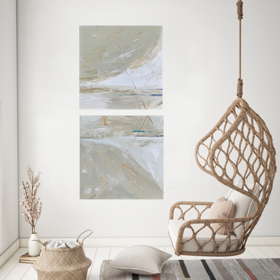 A diptych painting that can be hung in various orientations to convey different feelings could be a versatile and intriguing piece of art. When hung one way, the painting could depict a serene landscape under a striking half moon, evoking a sense of tranquility and wonder. The moon, being a symbol of mystique and dreams, heightens the emotional impact of the artwork.